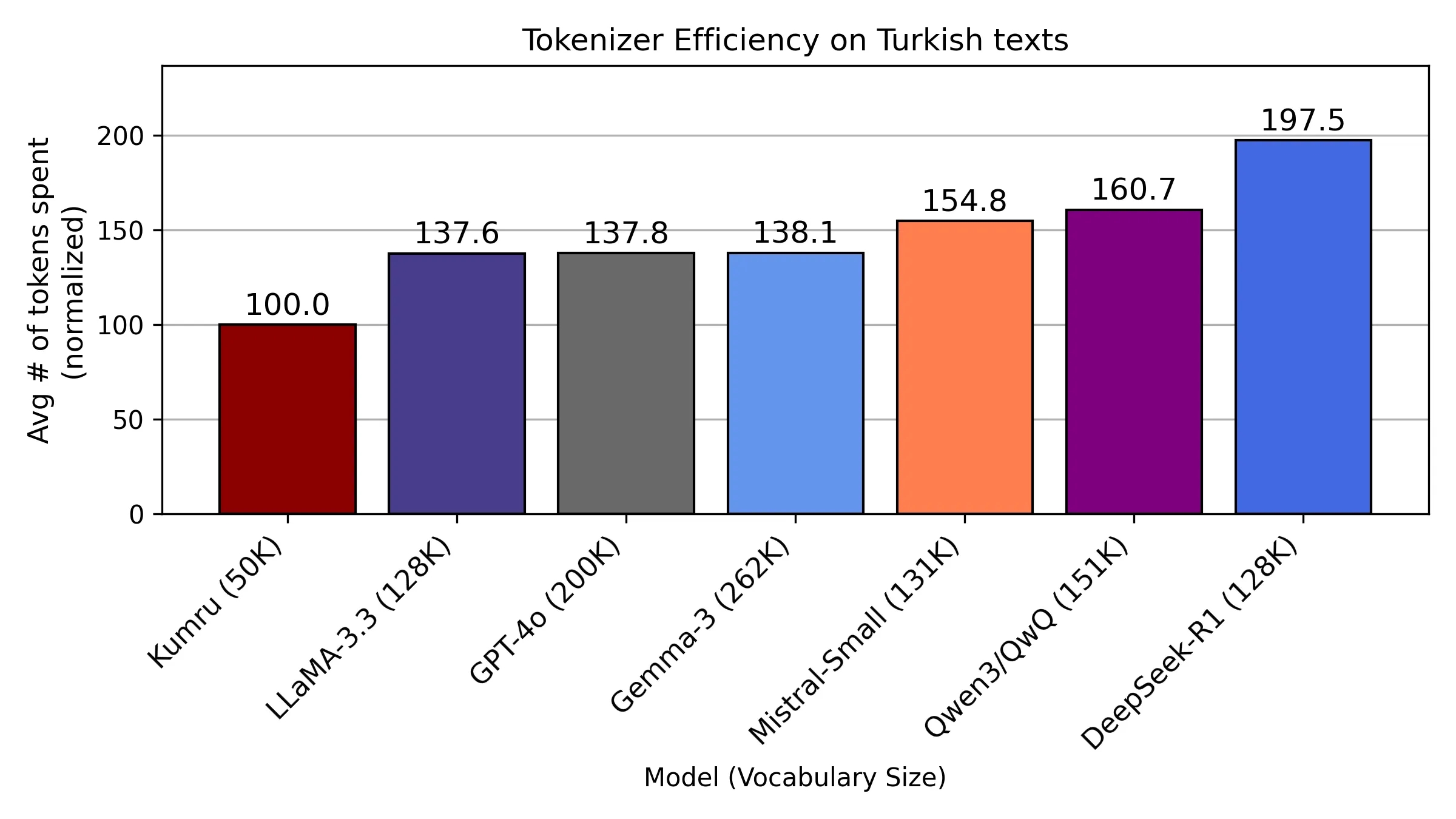 Kumru’nun tokenizasyon sistemi de özel olarak Türkçe için tasarlandı. Yeni RegEx tabanlı ön işlemci sayesinde satır sonları, noktalama işaretleri ve sayılar ayrı token’lar olarak işleniyor. Bu sayede model, metinleri yüzde 38 ila yüzde 98 daha az token kullanarak temsil edebiliyor. Böylece daha uzun metinleri daha hızlı ve düşük maliyetle işleyebiliyor.