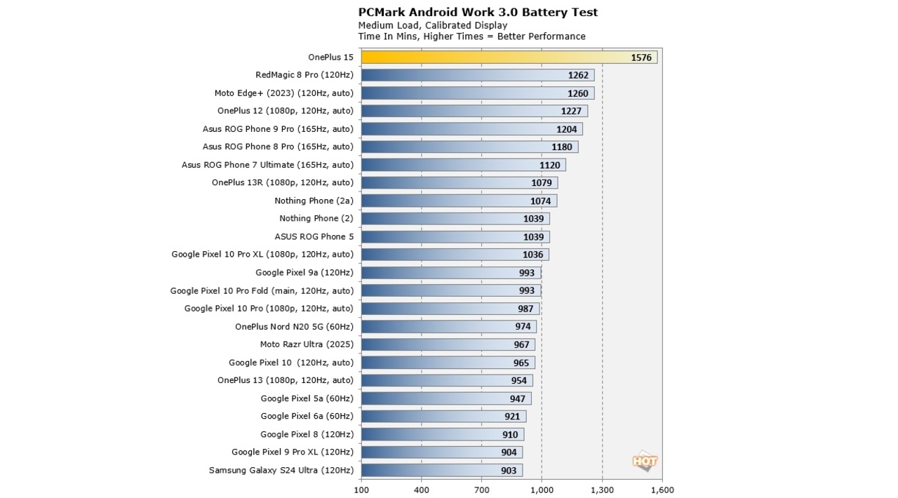 Yayınlanan sonuçlara göre OnePlus 15, PCMark 3.0 testinde tam 1.576 dakika dayanabildi. Bu süre, yaklaşık 26,2 saate denk geliyor. Söz konusu rekor, cihazın rakiplerini büyük farkla geride bırakmasını sağladı. Listeyi uzun süredir domine eden RedMagic 8 Pro modeli, 1.262 dakikalık skoruyla ikinci sıraya düşerken, OnePlus 15 bu rakibi tam 314 dakika farkla geride bıraktı.